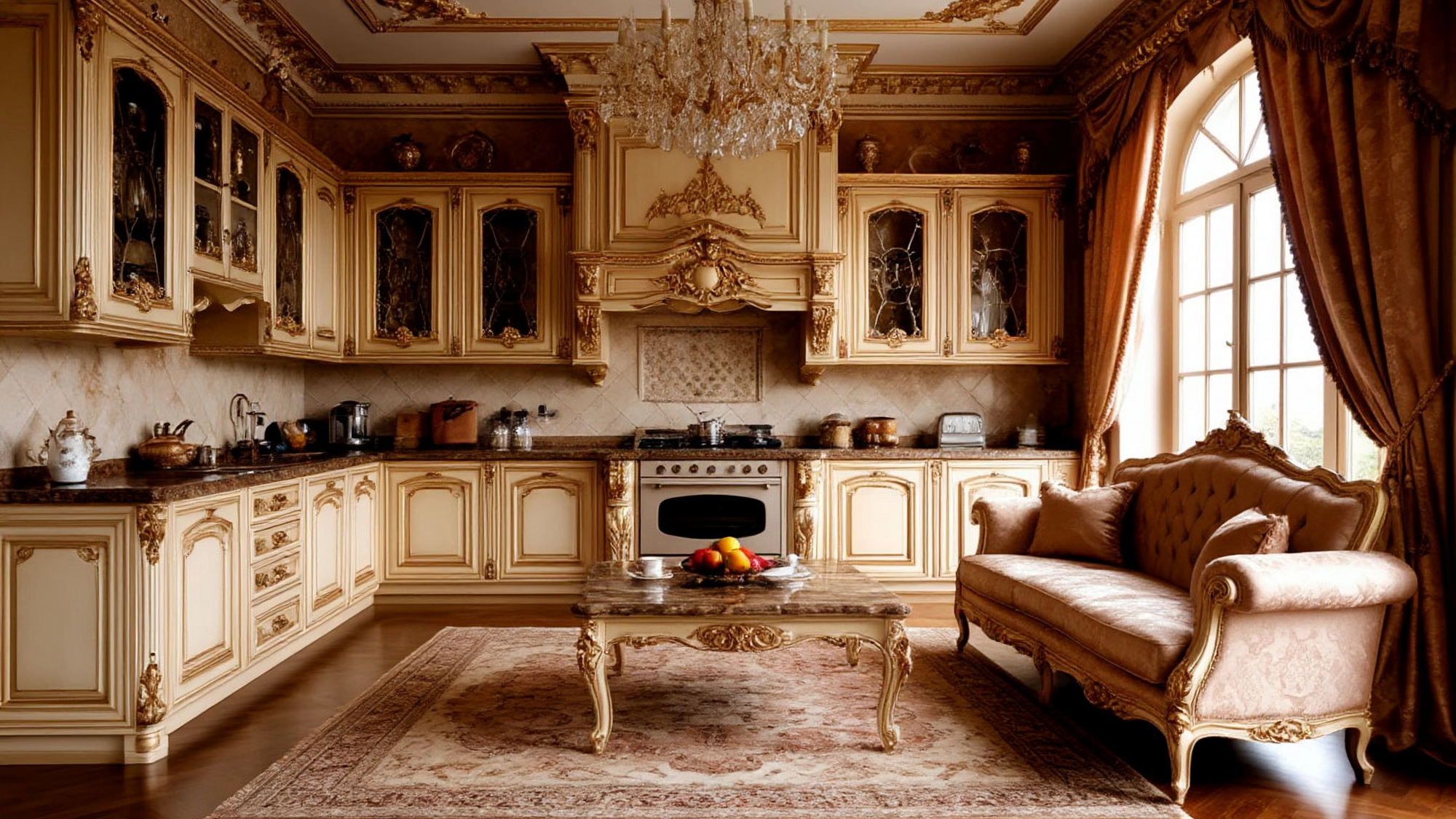 Важной частью композиции становится диван, который делает кухню не просто рабочим пространством, а полноценной зоной для отдыха и общения. Кухня с диваном в барочном стиле приобретает особую атмосферу — здесь хочется задержаться, провести время за неспешными разговорами, семейными ужинами или утренним кофе. Диван органично вписывается в общий ансамбль, поддерживая цветовую гамму и стилистическое направление, и при этом добавляет интерьеру мягкости и домашнего тепла.